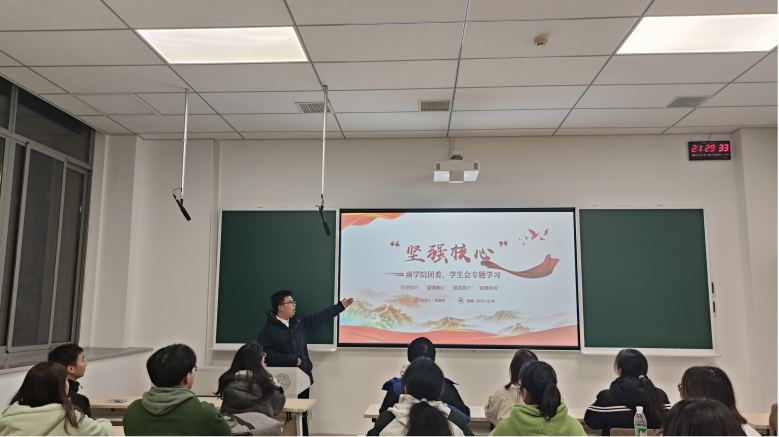 深入领会党的精神,强化思想引领。2023年12月6日晚21:00,FUN乐天使官方网站团委、学生会在新校区江湾楼会议室围绕“坚强核心”开展专题学习,本次专题学习会由团委、学生会成员朱宏宇担任主讲人,主席团、部长团成员全体参会。