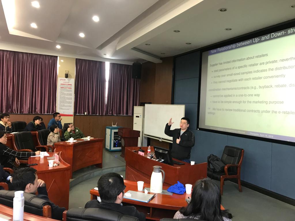 首先,李建斌教授给我们详细介绍了他们的团队Robust Team以及他们团队与B2B电商平台1号店,卓尔控股有限公司,跨境电商平台卓志供应链技术有限公司等合作最终实现产学研用的优秀案例。他基于1号店的实践从库存布局优化,库位推荐优化,波次优化,拣货路径优化四个方面详细介绍了他们团队是如何从社会实际案例中提炼出有价值的学术研究问题,并构建贴近现实的模型,解决电商平台公司工作中反复出现的问题,他们的多篇研究成果被发表在POM,MSOM等顶级期刊上。随后,李教授分享了他的论文“Optimal Remanufacturing Strategies with Name-You-Own-Price Recycling”探讨了在由自己负责回收和第三方负责回收的两种渠道选择背景下,供应链的利润,对环境的影响,消费者盈余是如何变化的;与传统的list-price机制相比,NYOP机制有哪些优势等问题。胡鹏教授对自己研究了10多年的补货成本结构下库存管理研究的最新研究 “Dynamic Inventory Management with General Replenishment Cost Structure”进行了了分享。胡鹏教授就自己的研究经验就如何找到自己想研究的问题提出了两点建议,一是从已有的文献中发现新的问题,在他的一篇论文中覆盖了自己研究方向的某个具体领域前人研究的所有方面并提出了最新的成果理论;二是从社会实践案例中提炼出有助于解决现实问题的学术研究问题。最后,本次讲座在一片热烈的掌声中圆满结束,本次讲座为乐天使官网师生提供了一次重要的学习交流机会,师生们受益匪浅。