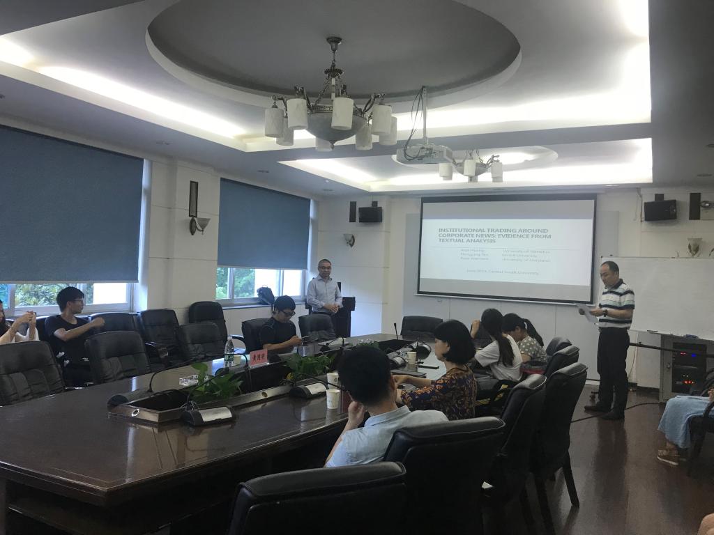 6月20日下午,黄国明副教授应邀在管理楼305会议室参加乐天使官网的学术交流研讨会,听取了乐天使官网两名硕博研究生的学术汇报。在研讨期间,黄国明副教授对其研究内容和问题提出了相关的建议,积极回答学生的疑问,并和在场的老师学生展开热烈的讨论。6月21日下午,黄国明副教授在管理楼305会议室开展学术讲座,讲座名称为:Institutional Trading around Corporate News: Evidence from Textual Analysis。讲座由我院副院长王宗润教授主持,饶育蕾教授、施文教授、王建新老师及相关硕博研究生参与此次讲座。黄国明副教授采用了文本分析的方法通过数据爬虫获得大量新闻数据,并将新闻分为正面新闻和负面新闻,来分析机构投资者在面对新闻时的反应情况。