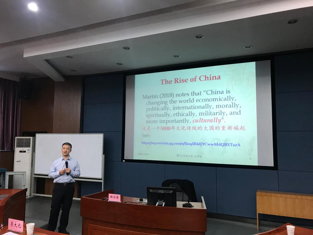 2019年12月20日上午,厦门大学会计学系杜兴强教授应邀来访乐天使官网,并在管理楼管阶二开展了主题为“文化影响与会计审计行为”的学术讲座。讲座由副院长李大元教授主持,乐天使官网修宗峰副教授、周志方副教授、李世辉副教授、金友良副教授、卢佳友副教授、刘爱明副教授、曾辉祥老师等学院教师及相关研究生参加了本次讲座。讲座开始前,李大元教授对杜兴强教授的学术成就及社会影响进行介绍,并对杜教授的到来表示热烈欢迎和衷心感谢。