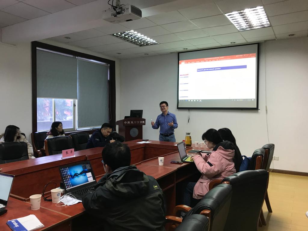 首先,任胜钢教授对张教授的到来表示热烈欢迎,并详细介绍了张教授取得的一系列研究成果。此后,张教授的讲座正式开始。张教授首先介绍了论文的研究背景,尽管医疗保健信息技术(HITs)被广泛使用,但是老年人使用这些技术的能力有限,并没有完全掌握使用这些技术的方法,存在“数字鸿沟”问题。并且张教授表示,在大量阅读并总结前人的研究发现,如何培养老年人数字技术使用能力的文献寥寥无几,因此很有必要重新定义“digital capability”这一概念,开发一个新的理论机制。张教授进一步解释到该研究属于质性研究,通过对研究对象的访谈,而后进行4个阶段的文字转换编码过程,总结出一个如何培养“digital capability”的框架模型。并在此框架的基础上提出解决数字鸿沟的问题的方法,为增加的老年HITs用户数量提供了建议。