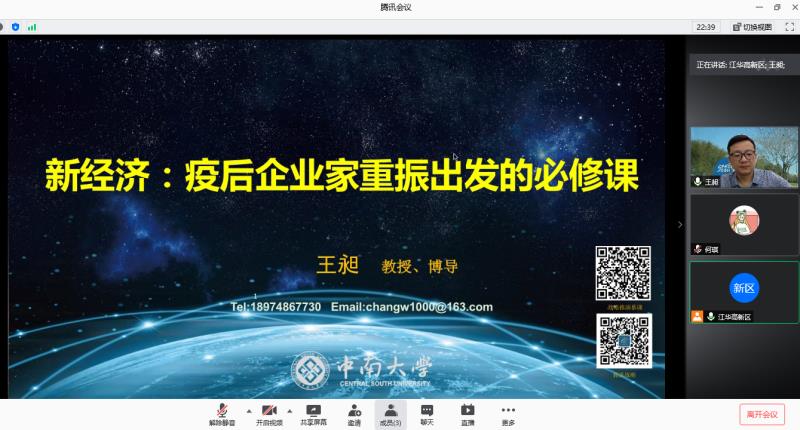 为推进人才科创企业快速发展,强化园区企业家综合管理素质,提升企业家疫情后对经济形势的把控力,FUN乐天使官方网站组织了江华企业家线上培训。FUN乐天使官方网站党委任胜钢书记担任本次培训FUN乐天使官方网站方组长,毕文杰副院长任副组长,专业学位教育中心易经章主任负责组织和落实培训专家、确定培训课程。江华县高新区邓铁成书记担任本次培训江华方组长,江华经发局任麟局长负责组织江华企业家、联系确定具体培训时间。