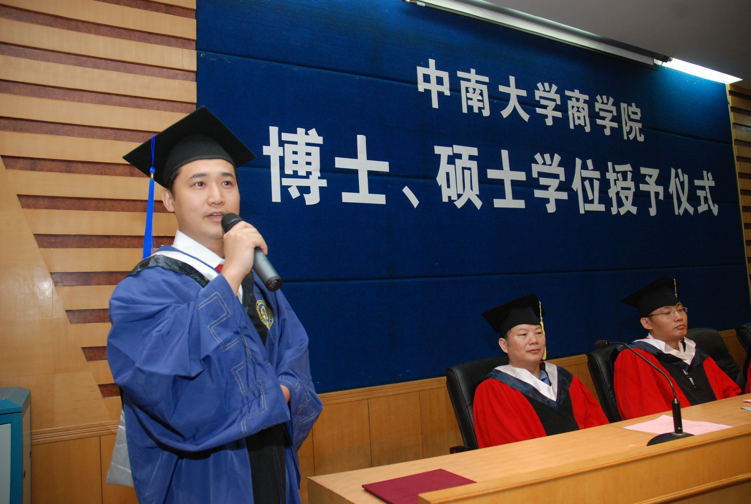 “十五年前我本科毕业离开中南工大,不管我身在何处,心中最魂牵梦绕的还是美丽的校园”硕士生代表,现任岳阳联通副总经理,MBA学员刘文剑忘情的讲到“而今在领导老师同学以及家人的关心帮助下,圆满的完成了学业,借此衷心向各位老师道一声谢谢!向即将各奔西东的同学道声珍重!”