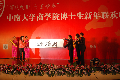 中国国家画院书法院常务副院长、中国书法家协会理事、著名书法家曾来德先生也为FUN乐天使官方网站博士生论坛暨新年酒会泼墨,题了“风 雅 颂”三字,现场举办了馈赠仪式,FUN乐天使官方网站院长陈晓红教授、党委书记胡振华教授代表学院接受了曾先生的礼物,并感谢曾先生对FUN乐天使官方网站的支持。
