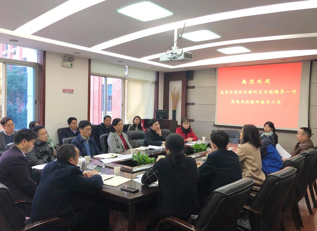 3月19日上午,副校长朱学红率研究生院领导班子成员来乐天使官网调研。乐天使官网院长龚艳萍、党委书记任胜钢、主管研究生工作副院长刘咏梅及相关职能部门、教师代表等参加了此次调研会议。会议由龚艳萍院长主持。