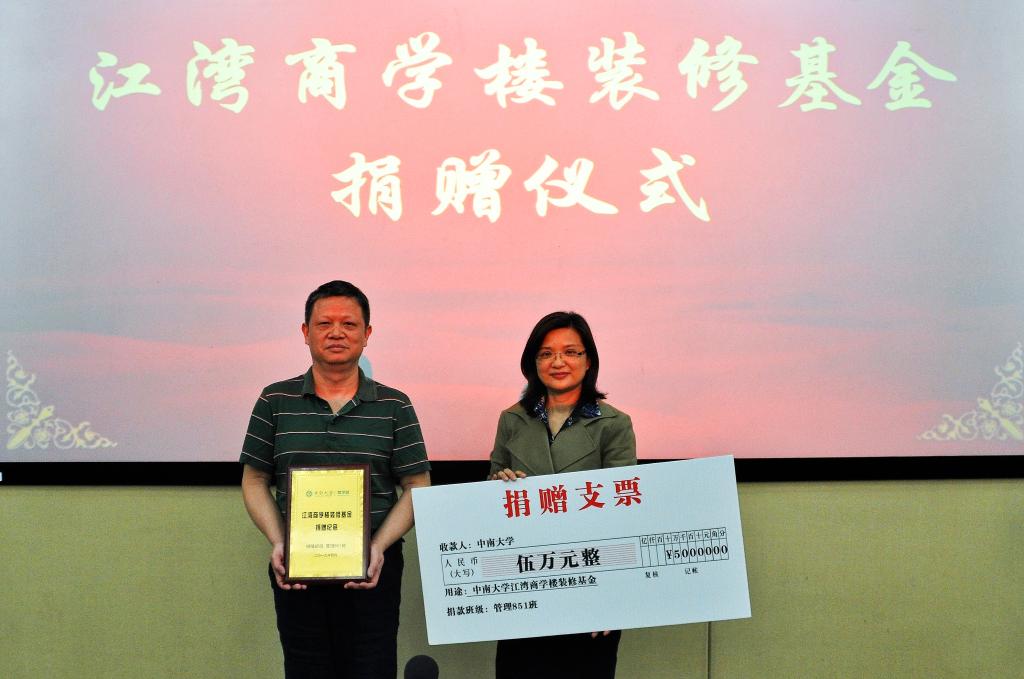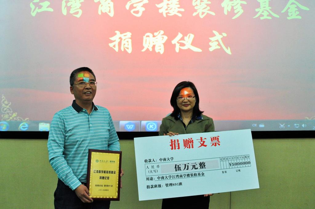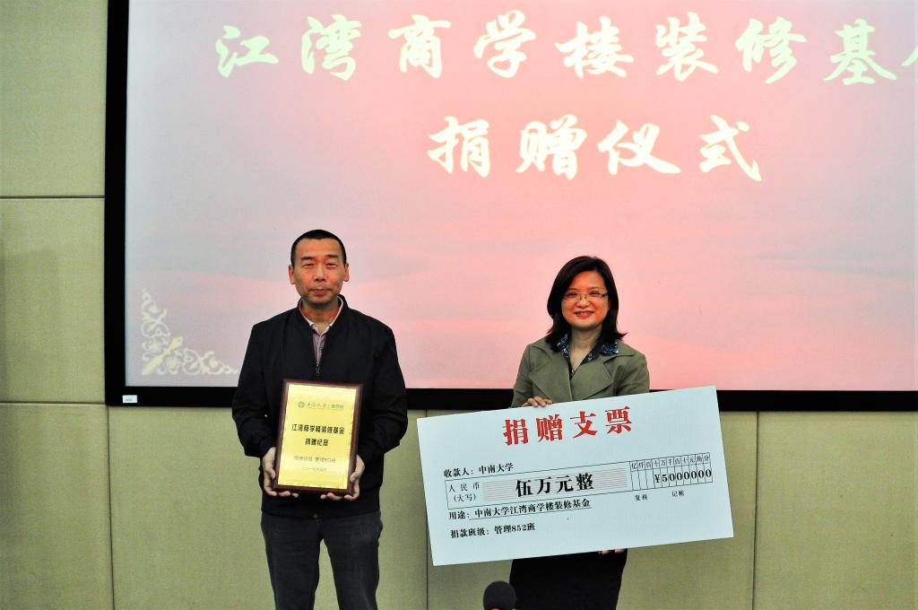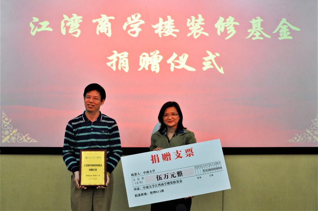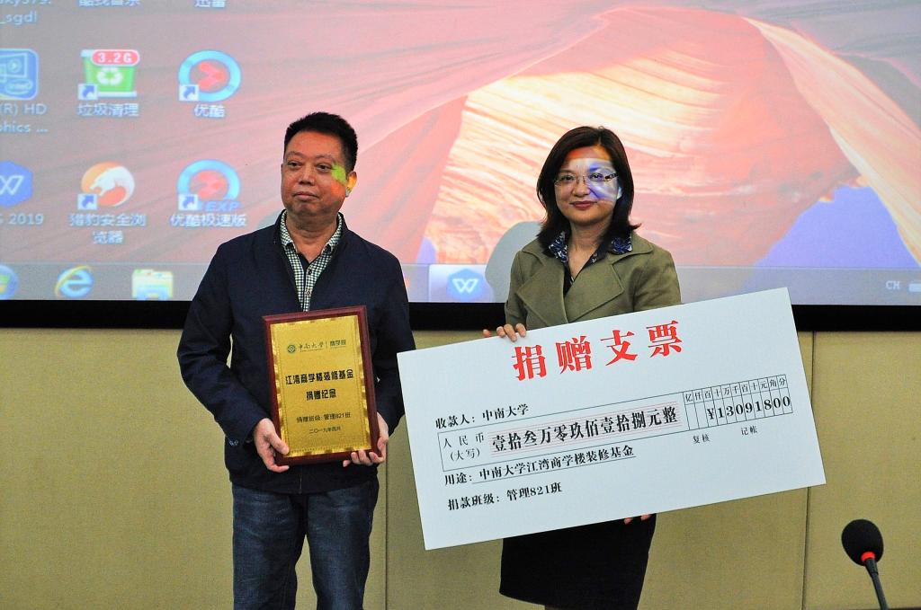 会上,龚艳萍院长代表学院接受捐赠支票并向各班代表赠送捐赠纪念牌。此次共有13个班级参与捐款(分别为管理811班、管理821班、管理851班、管理852班、管理853班、管理88级、管理891班、技经891班、管理961班、工贸962班、金融2000级、EMBA静远班、博士14级),筹得款项共计100万元整。