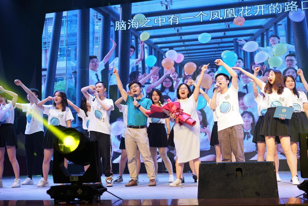 晚会尾声,由15级辅导员陈文、徐梓人老师及部分学生代表改编并演绎的歌曲《师生同麓》充分展现了商院学子的原创力,体现出浓浓的师生情。节目结束,但惊喜不停。由毕业生们拍摄的祝福视频出现在大屏幕上,同学们纷纷表达了对恩师的无限感激之情,引得两位辅导员也不禁潸然泪下。