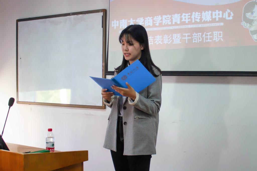 新一届青年传媒中心主任、工商1701班王勖同学随后作年度工作总结。她提到过去一年中心开展了诸多线上线下活动,如青梅拾光计划,承办网络文化节,举办悦读经典计划等,“季录商院”公众号、“中南商院学生荟”微博等各平台取得斐然成绩,为下一阶段的工作奠定了良好基础了良好的成果。
