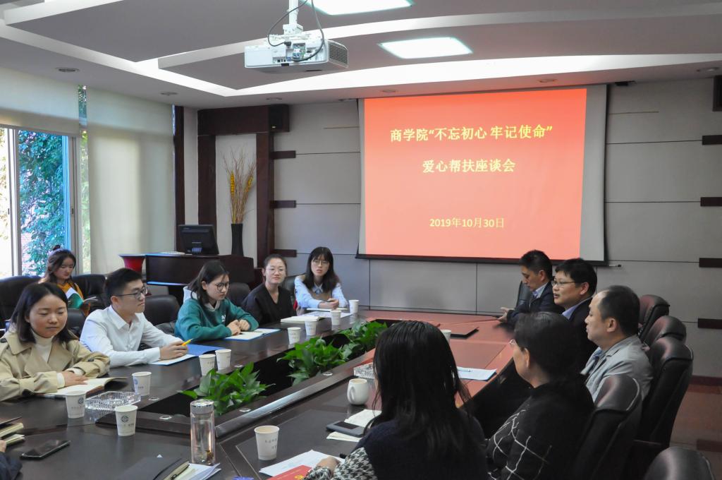 座谈会末,任书记说明了八名与会党委委员的爱心帮扶个人捐款发放问题,并交代了委员们与八名本科生结对子事宜。经院领导商议,学院将长期对家庭经济困难本科学生采取“一对一”帮扶,对硕博士学生采取导师帮扶措施,持续、切实为学生的学业、生活排忧解难。