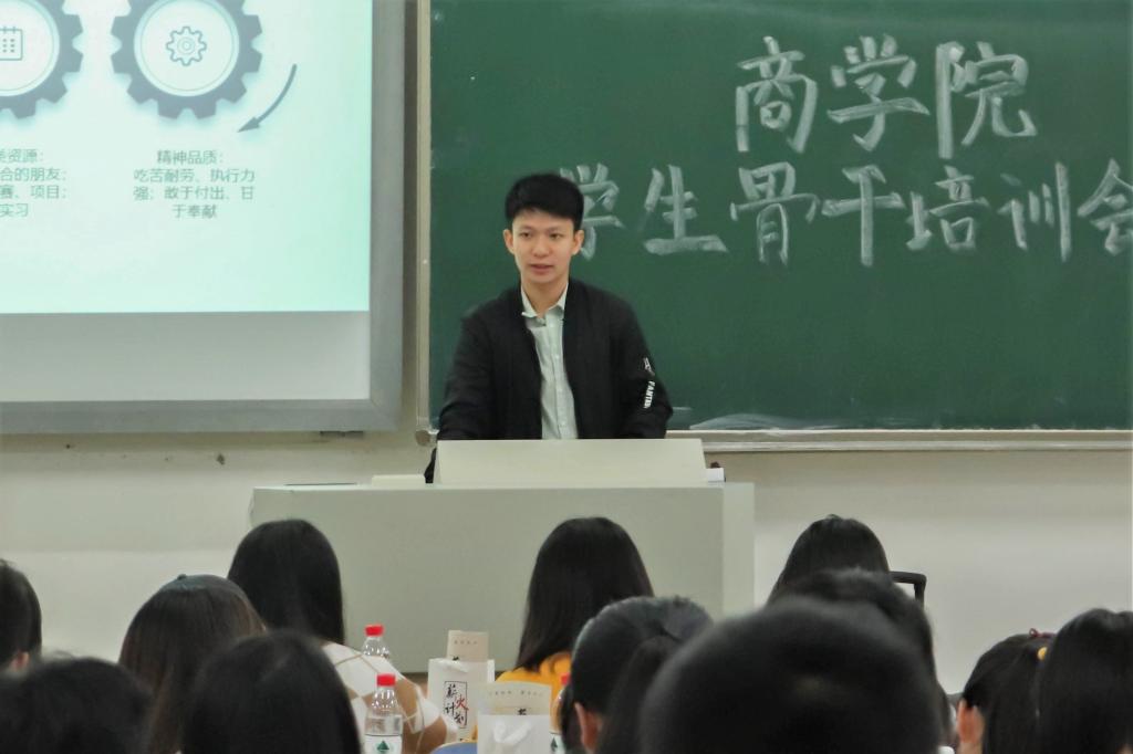继破冰游戏之后,17届团学会副主席朱昱承同学分享经验。他从“是什么”、“为什么”、“怎么做”三方面提出了对“学生干部”的独到见解,表达了对未来工作的希望,并在提问环节为学员释惑,提出可行方法。